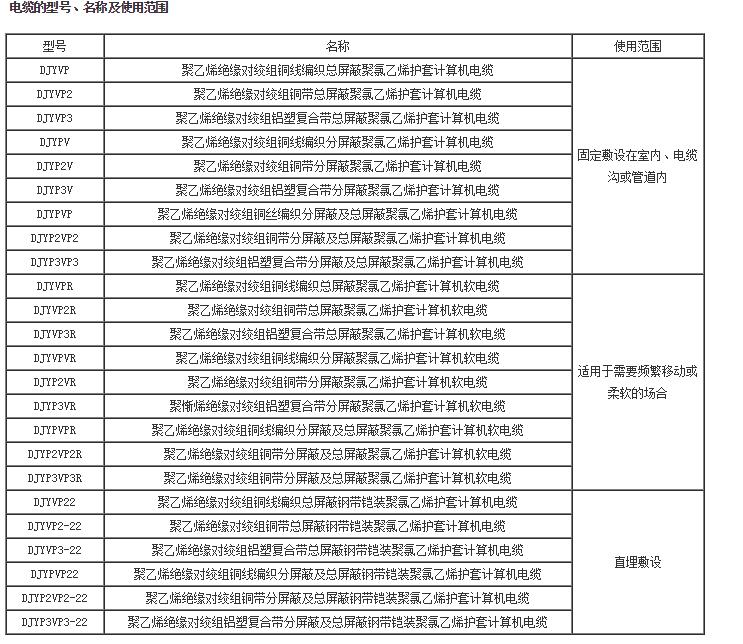 屏蔽材料有圓銅線、銅帶、鋁箔/塑料復(fù)合帶三種。屏蔽對與屏蔽對具有較好的絕緣性能,電纜在使用中若屏蔽對與屏蔽對之間出現(xiàn)電位差時,不會影響信號的傳輸質(zhì)量。 計算機電纜的型號、名稱及使用范圍見表。